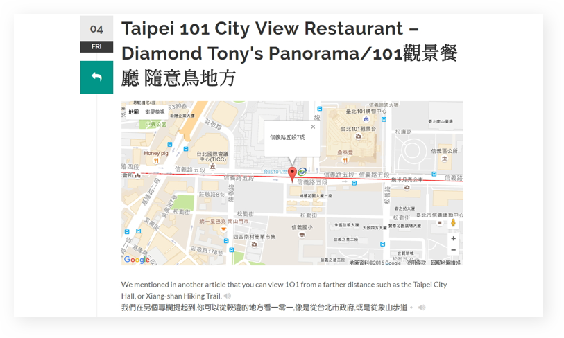 文章編輯頁面同時含有 Google Map 插入功能,我們可以從介面上即時的搜尋地圖,並取得經緯度資訊,只要按下插入鈕,就能立即將 Google Map 地圖插入在文章中給讀者預覽