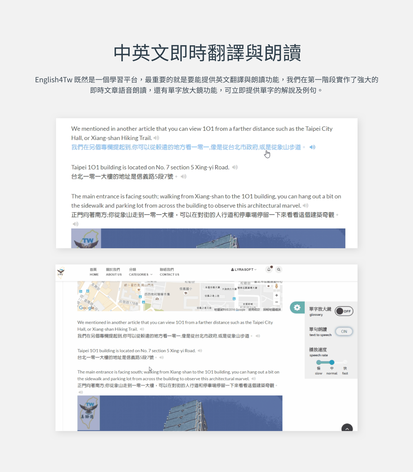透過中英文互動學習系統,分享到台灣每一個角落的旅記,為全球網友打開一扇窗。
